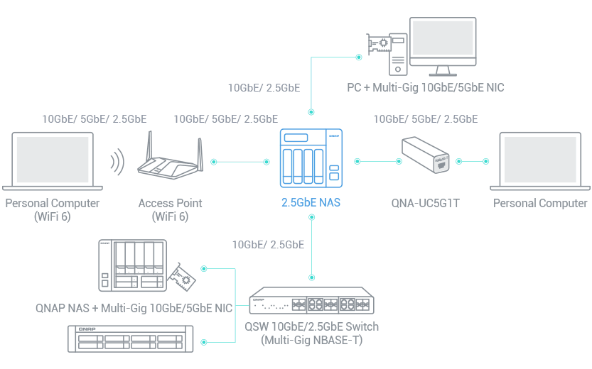 TVS-h874 ma dwa porty 2,5GbE. Firma QNAP oferuje wszechstronne, niedrogie urządzenia do przechowywania danych oraz urządzenia sieciowe, które zapewniają możliwość łączności. Możesz łatwo i elastycznie modernizować miejsce pracy lub sieć domową, aby obsłużyć aplikacje wymagające dużej przepustowości.