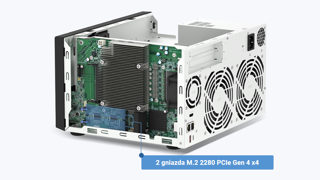 Model TVS-h874 jest wyposażony w dwa gniazda M.2 PCIe, które umożliwiają buforowanie dysków SSD lub puli pamięci masowej SSD, zapewniając większą wydajność, lub inne aplikacje.