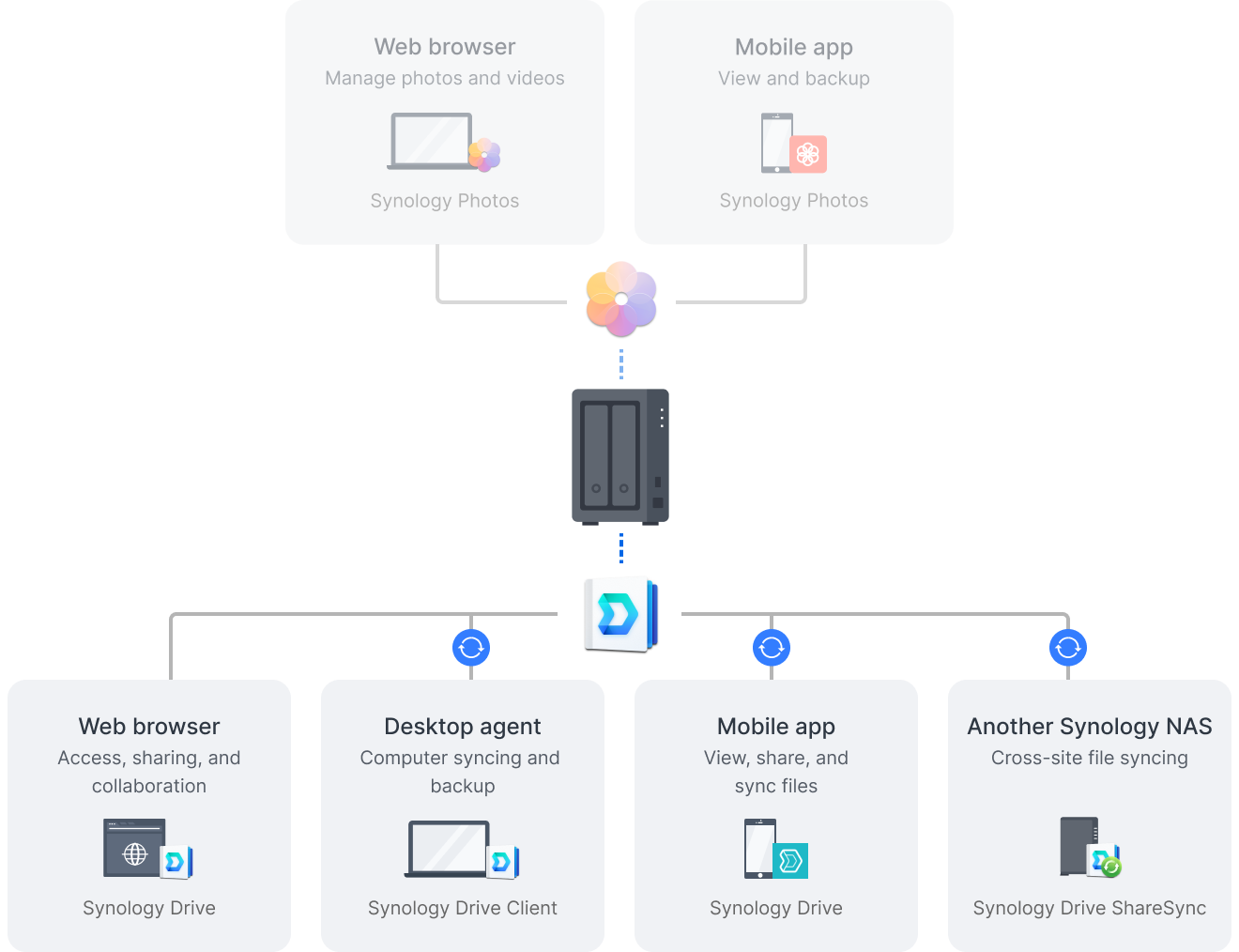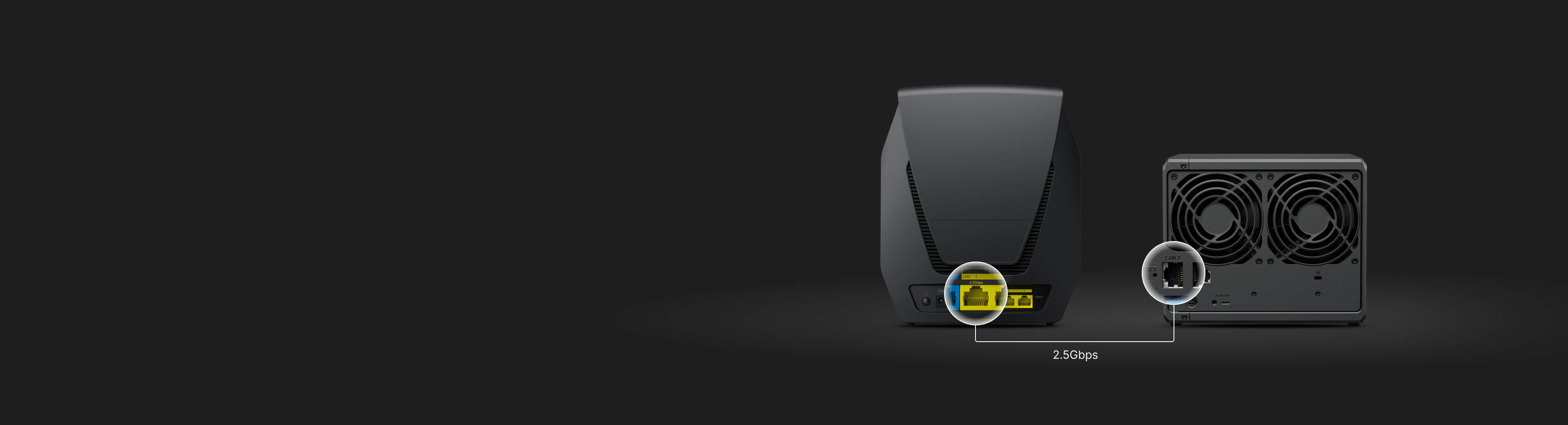 Połącz swój serwer NAS z urządzeniem Synology RT6600ax lub WRX560, aby zmaksymalizować łączność 2,5 GbE. Korzystaj z szybkich transferów i zabezpiecz swoją sieć dzięki funkcjom VLAN, zapobieganiu zagrożeniom oraz filtrowaniu stron internetowych — wszystko to za pośrednictwem znanego interfejsu Synology.