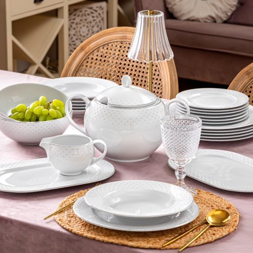 Serwis Carmen to elegancka i subtelna propozycja dla osób, które cenią klasyczne wzornictwo w nowoczesnym wydaniu. Delikatna dekoracja WA-91 opiera się na drobnym, symetrycznym motywie, który układa się w finezyjną, geometryczną siateczkę oplatającą brzegi naczyń. Subtelne, jasne akcenty dodają porcelanie lekkości, a jednocześnie sprawiają, że całość prezentuje się niezwykle stylowo i uniwersalnie.
