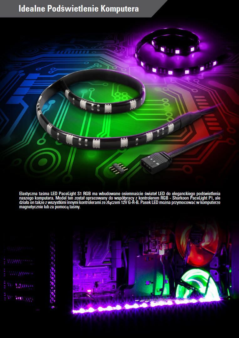 Elastyczna listwa, a właściwie taśma LED PaceLight S1 RGB ma wbudowane osiemnascie swiateł LED do eleganckiego podswietlenia naszego komputera.