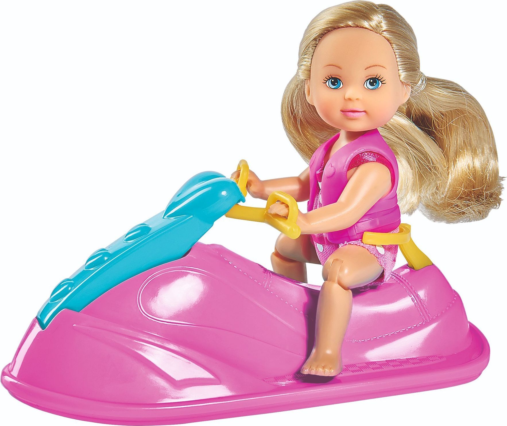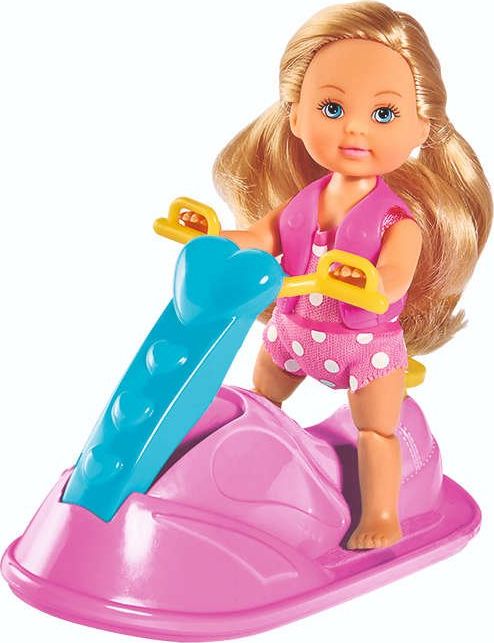 Laleczka Evi ubrana jest w różowy strój kąpielowy i ma włosy spięte w dwa kucyki. Siedzi na różowo-niebieskim skuterze wodnym. Laleczka posiada punkty artykulacji w kolanach.
