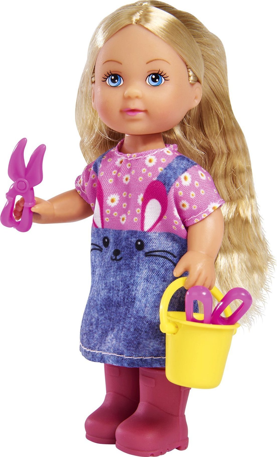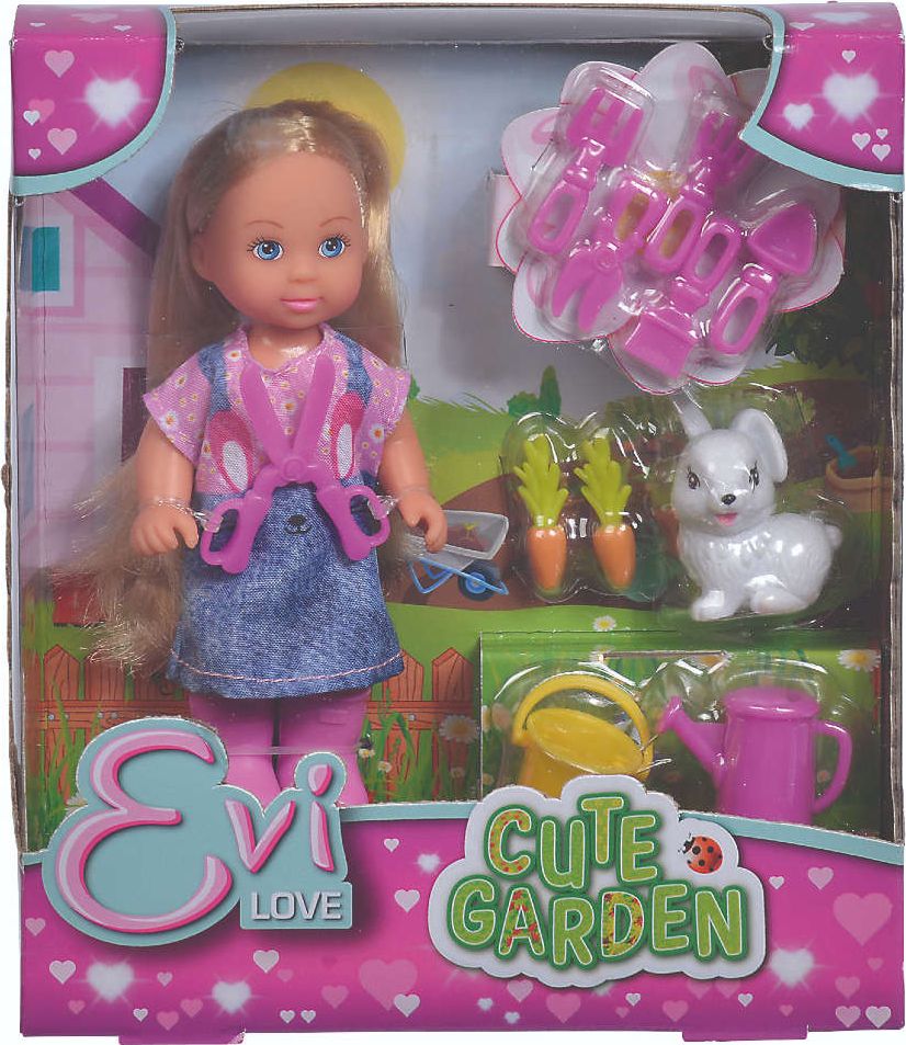 Laleczka Evi ma na sobie różowe kalosze i sukienkę z wizerunkiem króliczka. Laleczka spędza czas w ogrodzie razem z białym króliczkiem, który może zajadać marchewki.