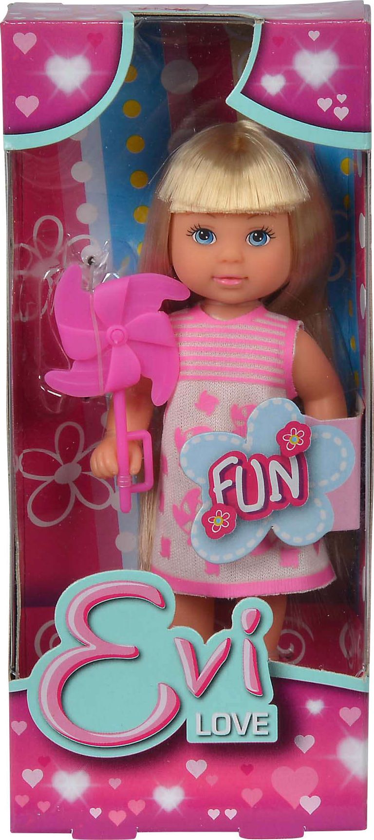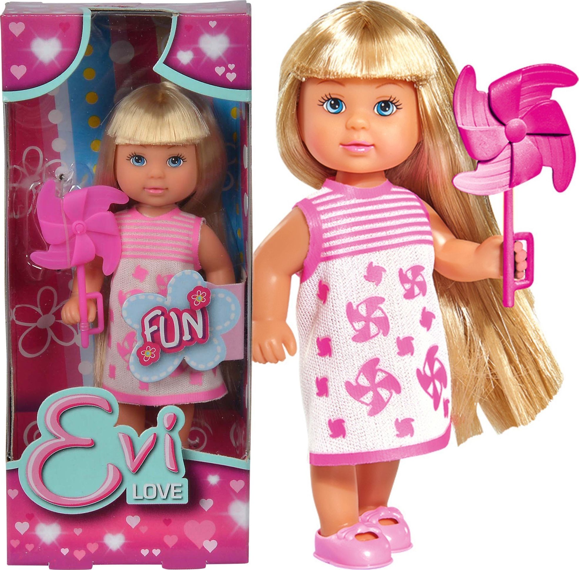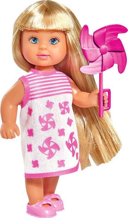 Evi ma długie blond włosy, uroczą sukienkę, buciki, a w ręku trzyma różowy wiatraczek.