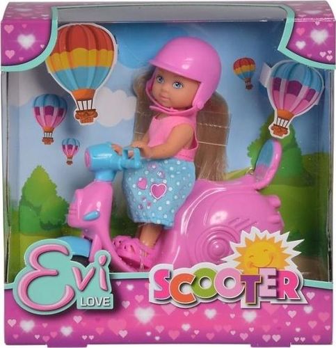 Laleczka Evi na różowym skuterze. Laleczka posiada niebieską spudniczkę, różowy kask i różową koszulkę.