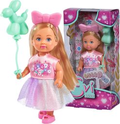Evi ma długie blond włosy, uroczą różową sukienkę z tiulem, różową kokardkę i niebieskie balerinki. W rączce laleczka trzyma turkusowy balonik.
