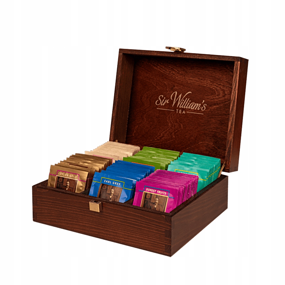 Oto rewelacyjna propozycja dla miłośników herbaty - drewniana skrzynka Sir William’s Tea wypełniona 90 pysznymi herbatami. Skrzynka wykonana jest z naturalnego drewna i stanowi nie tylko praktyczne rozwiązanie do przechowywania herbat, ale także piękny element dekoracyjny dla Twojego domu lub biura.
