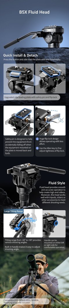 Model SP024+B5X został wyposażony w głowicę płynącą B5X, która umożliwia gładkie ruchy oraz precyzyjne ustawienia. Dzięki temu użytkownicy mogą łatwo dostosować kąt i położenie swojego sprzętu, co jest kluczowe podczas obserwacji przyrody.