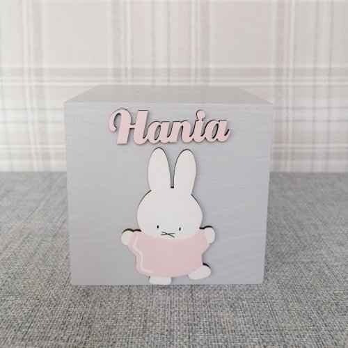 Z przodu skarbonki znajduje się ręcznie malowany przez naszych plastyków dekor oraz drewniany napis z imieniem dziecka.
