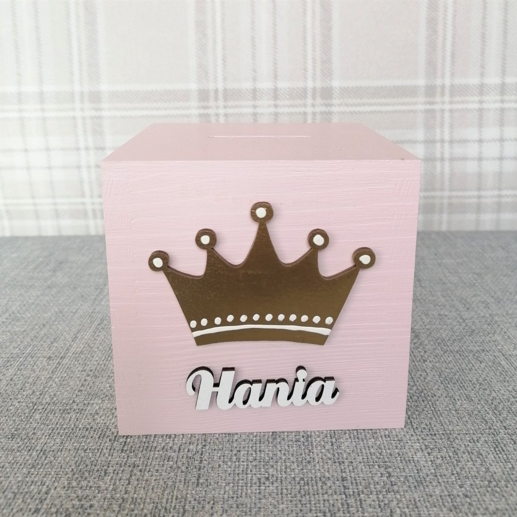 Z przodu skarbonki znajduje się ręcznie malowany przez naszych plastyków dekor oraz drewniany napis z imieniem dziecka.