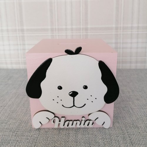 Z przodu skarbonki znajduje się ręcznie malowany przez naszych plastyków dekor oraz drewniany napis z imieniem dziecka.
