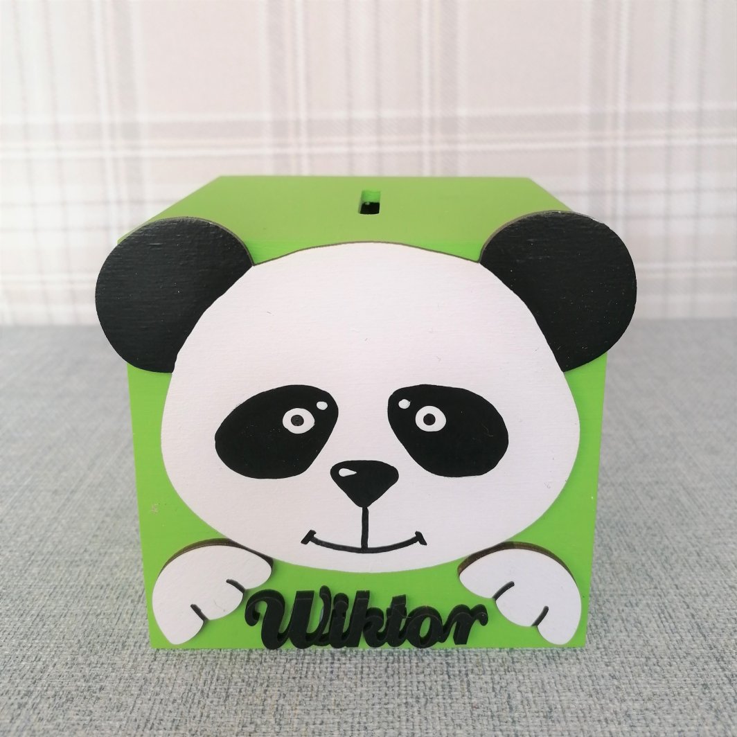 Z przodu skarbonki znajduje się ręcznie malowany przez naszych plastyków dekor oraz drewniany napis z imieniem dziecka.