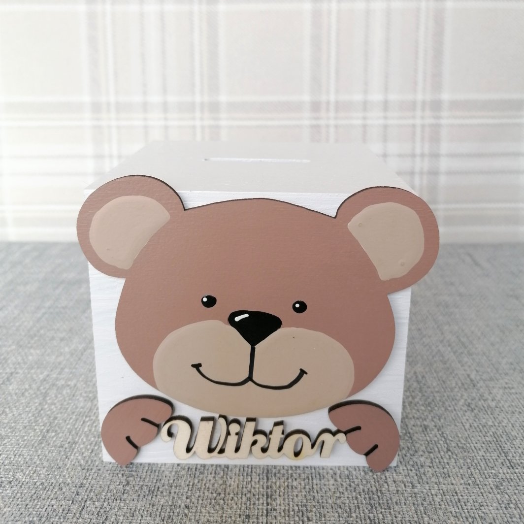 Z przodu skarbonki znajduje się ręcznie malowany przez naszych plastyków dekor oraz drewniany napis z imieniem dziecka.
