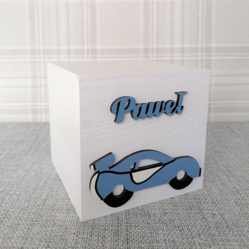 Z przodu skarbonki znajduje się ręcznie malowany przez naszych plastyków dekor oraz drewniany napis z imieniem dziecka.
