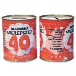 skarbonka metalowa puszka urodzinowa z napisem "Skarbonka Najlepszej 40"