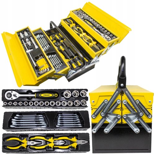 Skrzynka narzędziowa WMC to wszechstronny zestaw składający się z 87 elementów, idealny zarówno dla domowych majsterkowiczów, jak i profesjonalistów. Dzięki różnorodnym narzędziom, takim jak klucze płasko-oczkowe, wkrętaki, szczypce i nasadki, ten zestaw stanowi funkcjonalne i praktyczne rozwiązanie do realizacji różnych prac w domu i warsztacie.