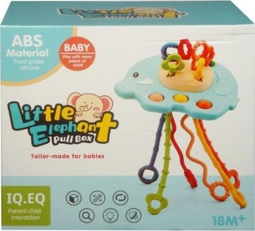 Plastikowo-gumowa zabawka dla malucha. Zabawka ma kształt słonika i posiada kolorowe gumowe linki w różnych kształtach i kolorach, które dzieci mogą przeciągać. Linki wykonane z bezpiecznej gumy, które dzieci mogą brać do buzi. Zabawka posiada również popularną zabawę pop it. Zabawka rozwija u dzieci logiczne myślenie, dzieci dzięki zabawce poznają kształty i rozwijają zmysł dotyku. Produkt zapakowany w kartonowe opakowanie. Podane wymiary są wymiarami opakowania.