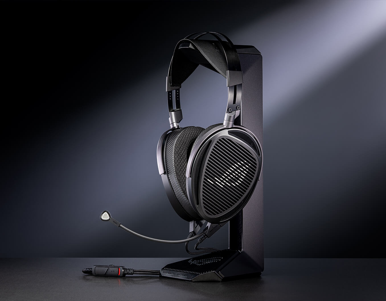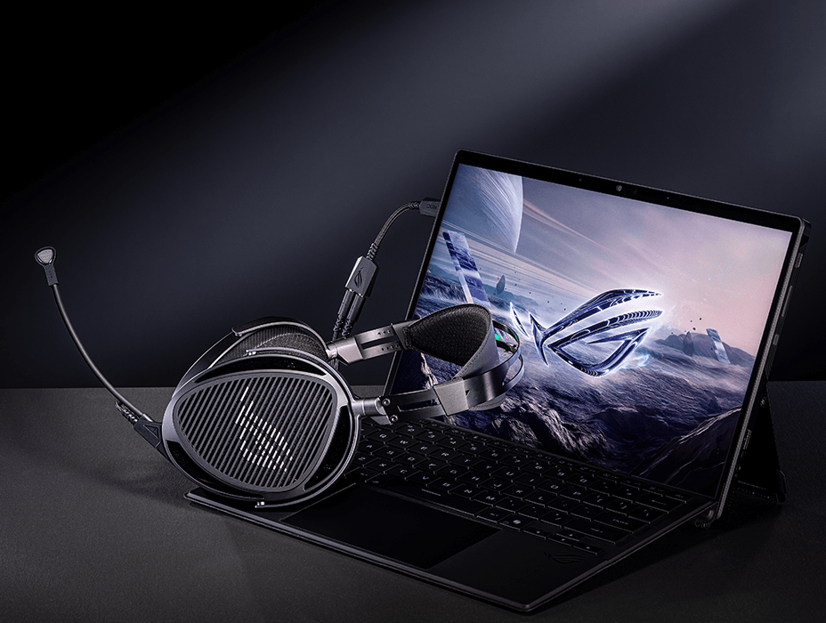 Zestaw słuchawkowy do gier ROG Kithara z przetwornikami magnetycznymi HIFIMAN o średnicy 100 mm, architekturą otwartą, pełnopasmowym mikrofonem MEMS, dwoma wejściami 3,5 mm, zbalansowanymi wtyczkami 4,4 mm, 3,5 mm i 6,3 mm.