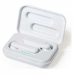 Słuchawki bezprzewodowe douszne w kolorze białym. Zabierz je ze sobą i słuchaj muzyki w dowolnym miejscu o dowolnym czasie.