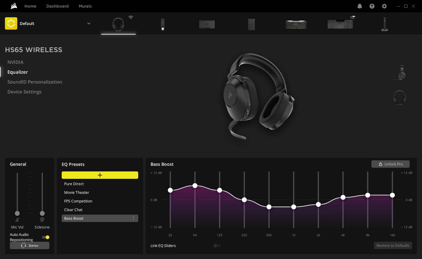 Wszechstronne oprogramowania CORSAIR iCUE oferuje niestandardowe ustawienia korektora dźwięku, realistyczny dźwięk przestrzenny 7.1 i wiele innych funkcji.