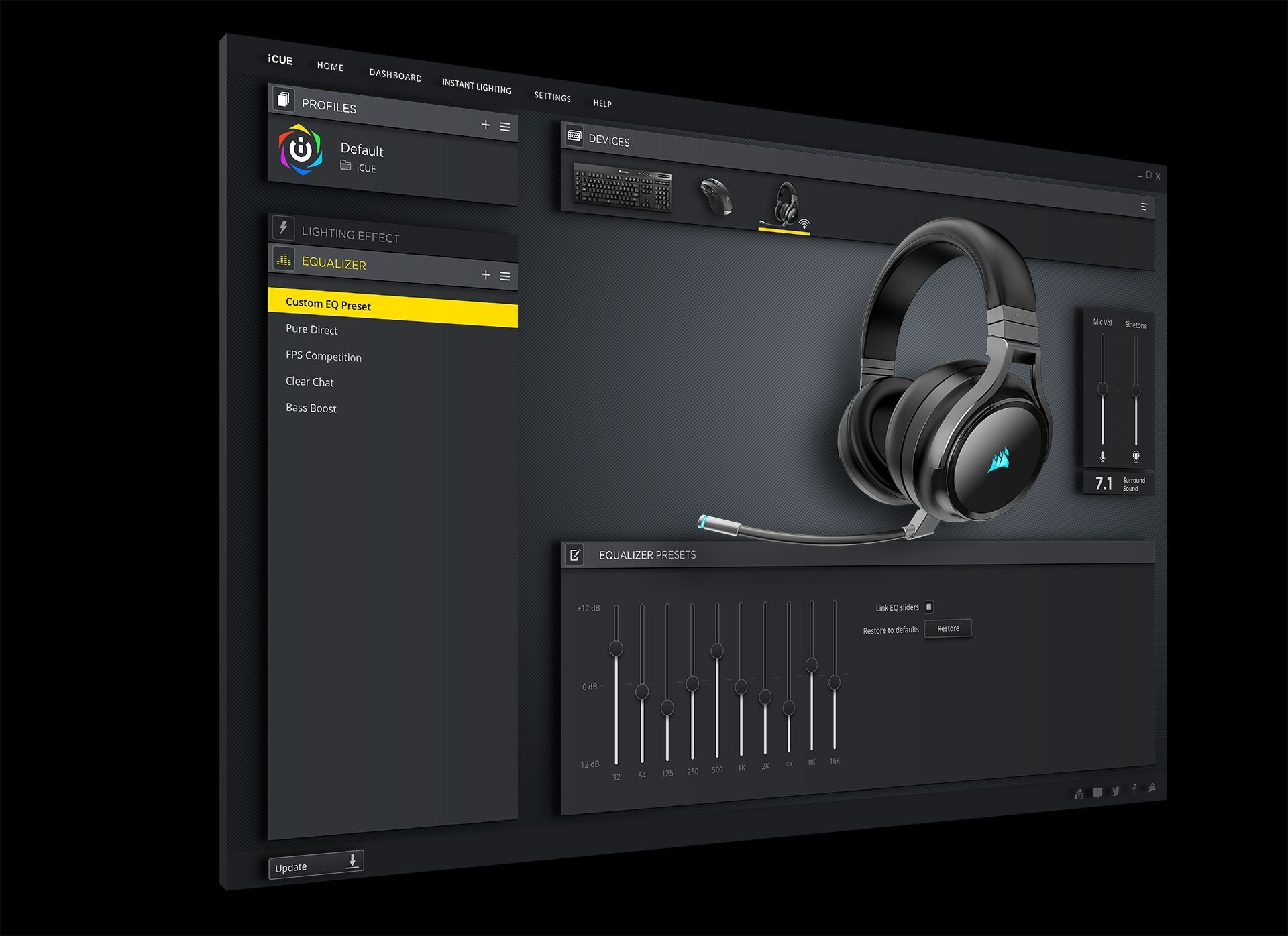 Oprogramowanie CORSAIR iCUE umożliwia wstępnie dostrojone profile audio, niestandardowe ustawienia korektora, wciągający dźwięk przestrzenny 7.1 i kontrolę sidetone.