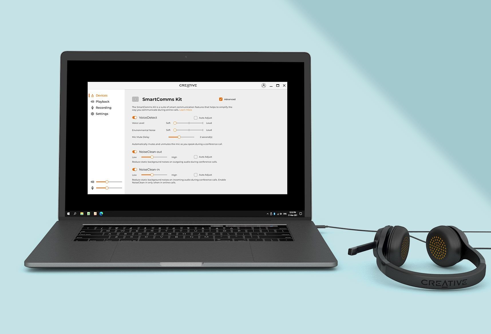 Użytkownicy systemu Windows 10 mogą pobrać aplikację Creative i uzyskać dostęp do zupełnie nowych narzędzi SmartComms Kit! Uprość sposób komunikowania się za pomocą pakietu inteligentnych funkcji zaprojektowanych specjalnie do połączeń internetowych. Dzięki funkcjom takim jak VoiceDetect, która automatycznie wykrywa Twój głos i aktywuje mikrofon, gdy mówisz, oraz NoiseClean, która skutecznie niweluje wszelkie niepożądane szumy tła* podczas rozmów online, możesz cieszyć się przyjemniejszymi rozmowami - wystarczy kilka kliknięć.