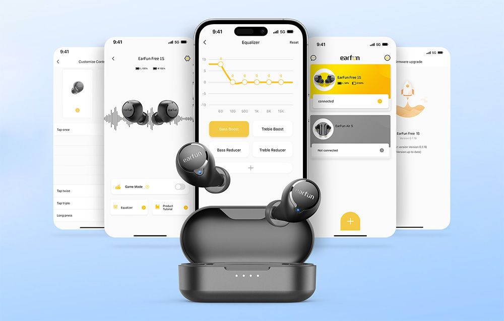 Zyskasz dostęp do dodatkowych funkcji słuchawek dzięki aplikacji EarFun Audio. Bezpłatna aplikacja dostępna jest zarówno dla użytkowników systemu Android, jak i Apple. Dzięki niej możesz zmieniać ustawienia EQ, sprawdzać stan naładowania akumulatora, a także zmieniać funkcję paneli dotykowych.