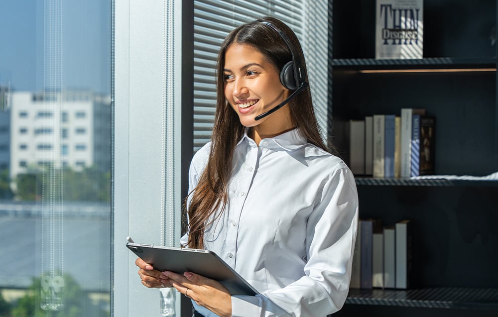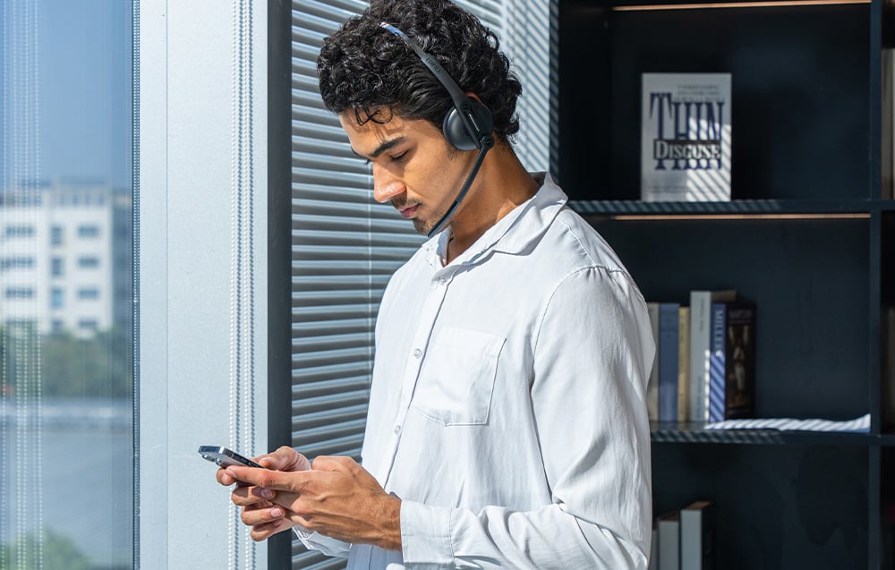 Dwa mikrofony wspierane algorytmami sztucznej inteligencji skutecznie eliminują dźwięki tła, dzięki czemu rozmówca słyszy głos wyraźnie nawet w głośnym biurze. Rozwiązanie to ogranicza potrzebę powtarzania informacji i poprawia płynność rozmów. Obrotowy w zakresie 240° pałąk mikrofonu pozwala wygodnie ustawić go po lewej lub prawej stronie, więc z łatwością dostosujesz zestaw słuchawkowy do swoich preferencji.
