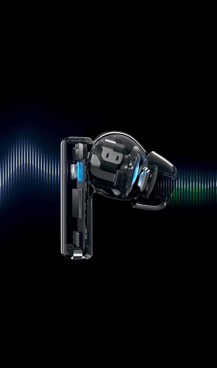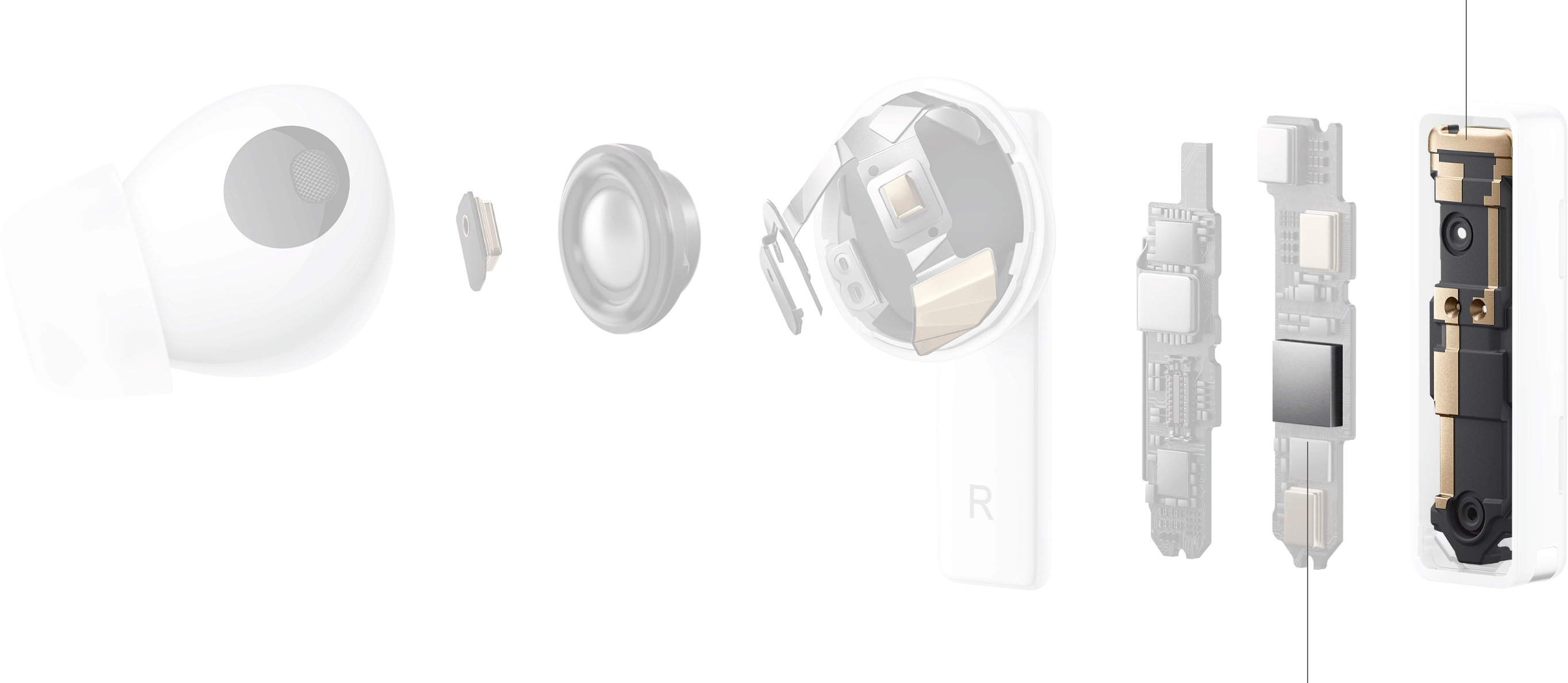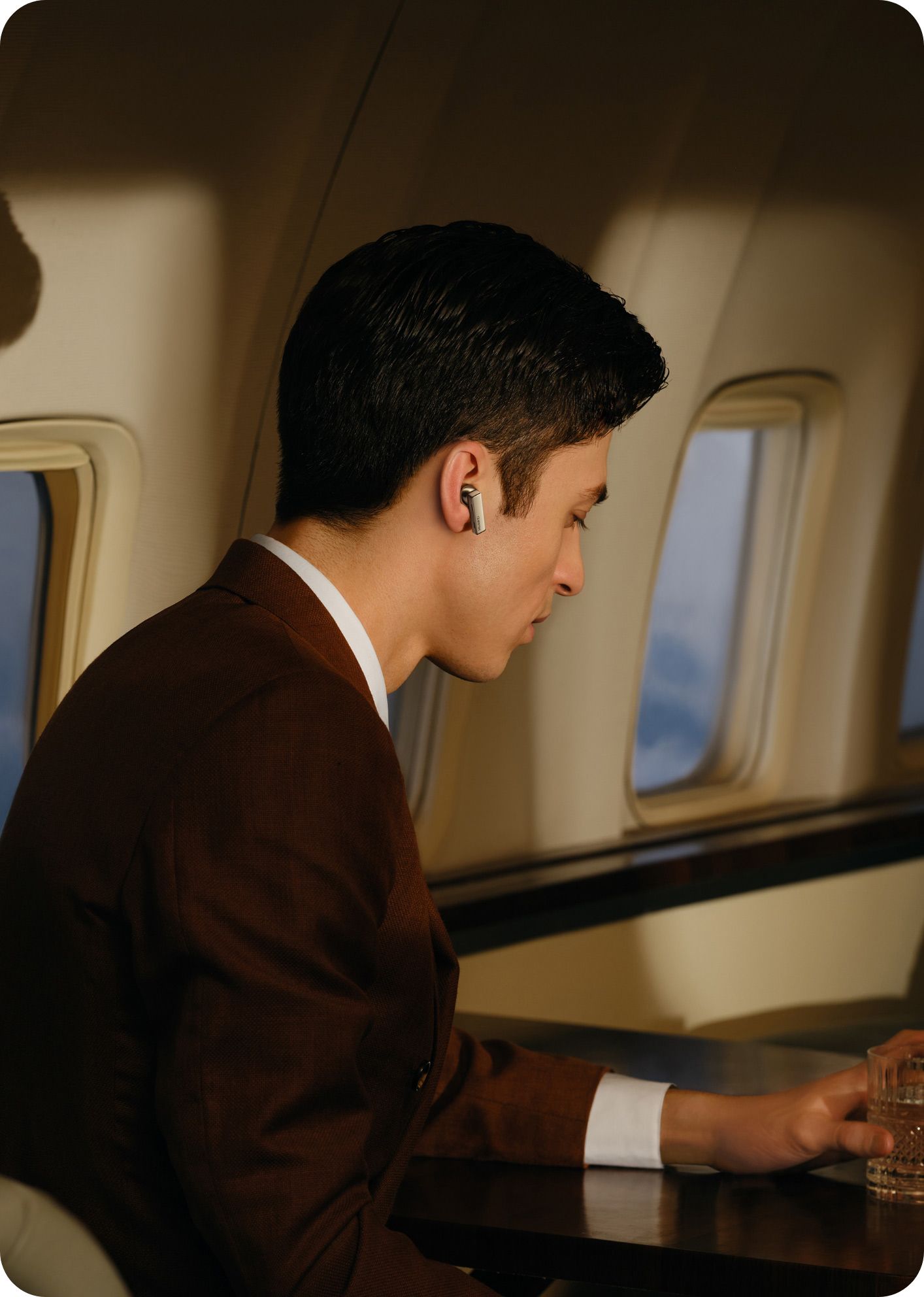 Dzięki hybrydowej aktywnej redukcji szumów mikrofony skierowane do wewnątrz i na zewnątrz wykrywają niepożądany hałas w otoczeniu i w uchu. Następnie dynamiczne przetworniki generują precyzyjny sygnał niwelujący. Osiągając efekt redukcji szumów do 40 dB, HUAWEI FreeBuds Pro pozwalają zaznać kojącego wyciszenia na życzenie.