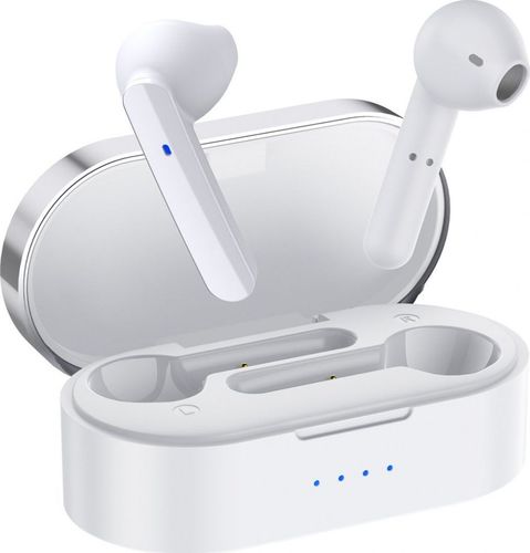 Ergonomiczne słuchawki bezprzewodowe, dokanałowe kompatybilne z każdym modelem telefonu / tabletu wyposażonym w moduł bluetooth. Model posiada stylowe etui ładujące z diodami LED, który pokazuje procentowe naładowanie akumulatora powerbanku oraz podłączonych słuchawek.