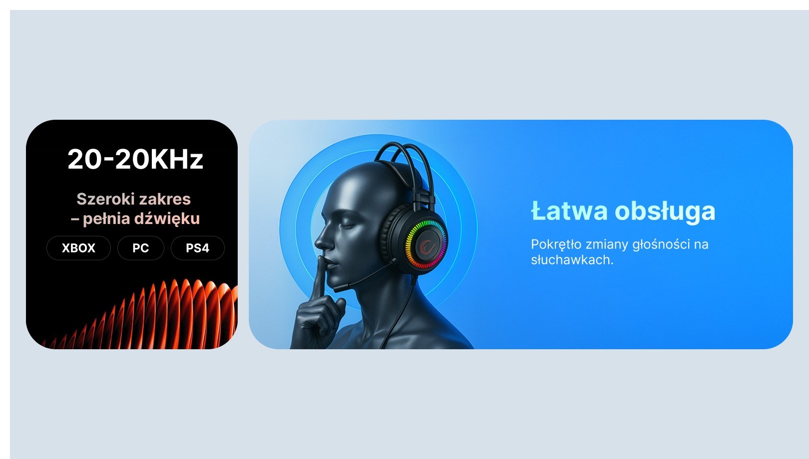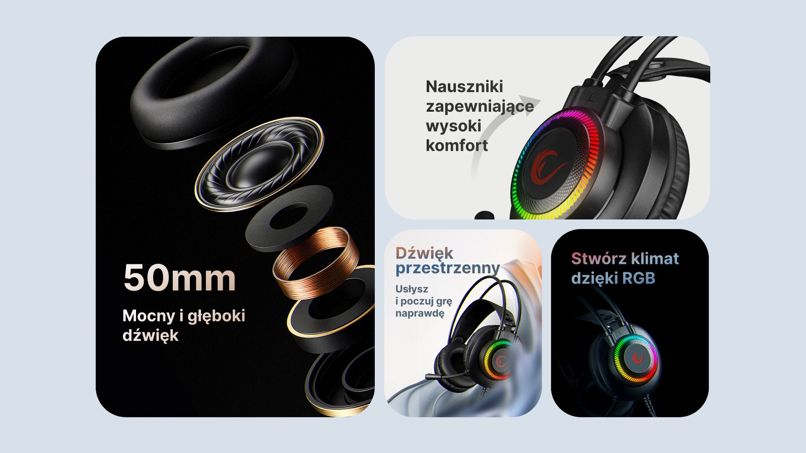 - Duże przetworniki 50 mm: mocny bas i pełna dynamika w każdej grze.
