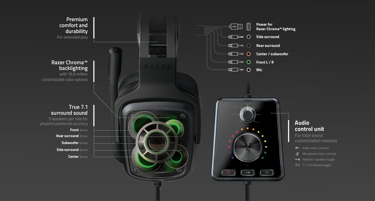 Całkowicie nowa jednostka sterowania dźwiękiem Razer Tiamat 7.1 V2 została zaprojektowana od podstaw, aby zapewnić więcej mocy na wyciągnięcie ręki, a także stylowo dzięki oświetleniu Razer Chroma. Kontroluj głośność każdego kanału audio, a nawet przełączaj się między prawdziwym dźwiękiem przestrzennym 7.1 a dźwiękiem stereofonicznym, aby perfekcyjnie odtworzyć dźwięk z dowolnego źródła.