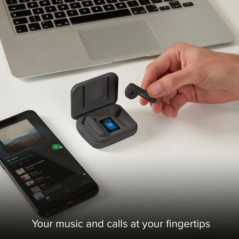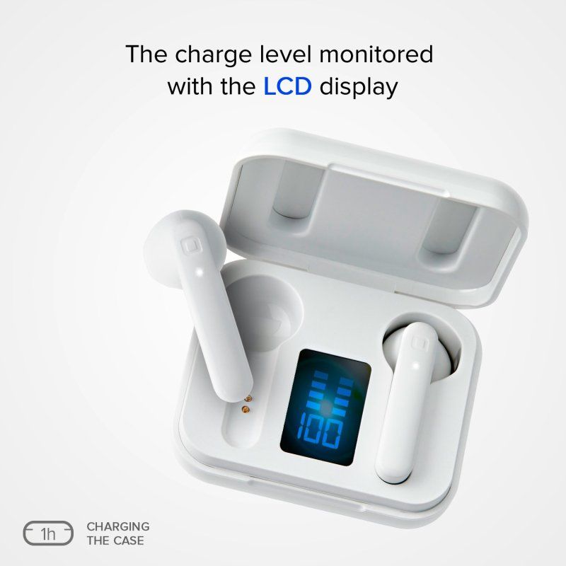Idealne do słuchania muzyki i rozmów, słuchawki Twin Hop mają podstawę z ekranem LCD. Zawsze będziesz mieć kontrolę nad ich stanem naładowania. Dzięki technologii True Wireless Stereo słuchawki łączą się ze sobą bez użycia przewodów.
