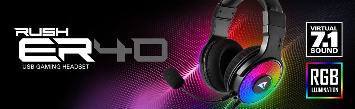 Gamingowy zestaw słuchawkowy Rush ER40 zachwyca zarówno akustycznie, jak i wyglądem: 50-milimetrowy przetwornik i oprogramowanie z 10-pasmowym equalizerem zawsze zapewnią ekscytujące wrażenia słuchowe. Wizualnie zestaw zachwyca podświetleniem 3D-RGB na nausznikach. Regulowany pałąk i ruchome muszle słuchawkowe zapewniają wygodę noszenia.