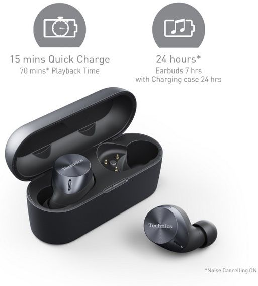 Czas pracy z aktywną redukcją szumów wynosi do 7 godzin na jednym ładowaniu, a kompaktowe etui ładujące zapewnia łącznie do 24 godzin. Szybkie ładowanie umożliwia odtwarzanie nawet do 70 minut.