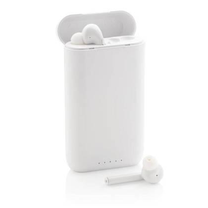 Power bank 5000 mAh, słuchawki bezprzewodowe TWS (True Wireless Stereo) BT 5.0, diody wskazujące poziom naładowania, słuchawki i obudowa z tworzywa ABS, wbudowany akumulator litowo-polimerowy klasy A power banku pozwala na naładowanie telefonu do 2 razy, wbudowany akumulator o pojemności 40 mAh w słuchawkach pozwala na odtwarzanie muzyki do 2 godzin, ponowne naładowanie w 4 godziny, zasięg do 10 m, wejście USB typu C 5V/2A, wyjście USB 5V/2A, kabel USB typu C z TPE bez dodatku PVC w komplecie