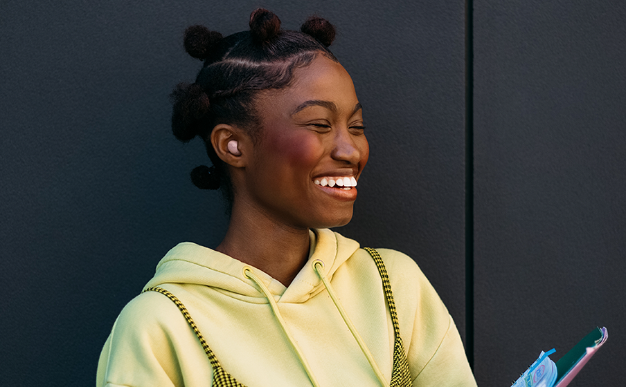 Dwa mikrofony na każdej słuchawce wyraźnie odbierają i przesyłają głos, jednocześnie eliminując hałas otoczenia. Dzięki temu możesz wykonywać czyste połączenia nawet podczas przechadzki w zatłoczonym parku w wietrzny dzień.