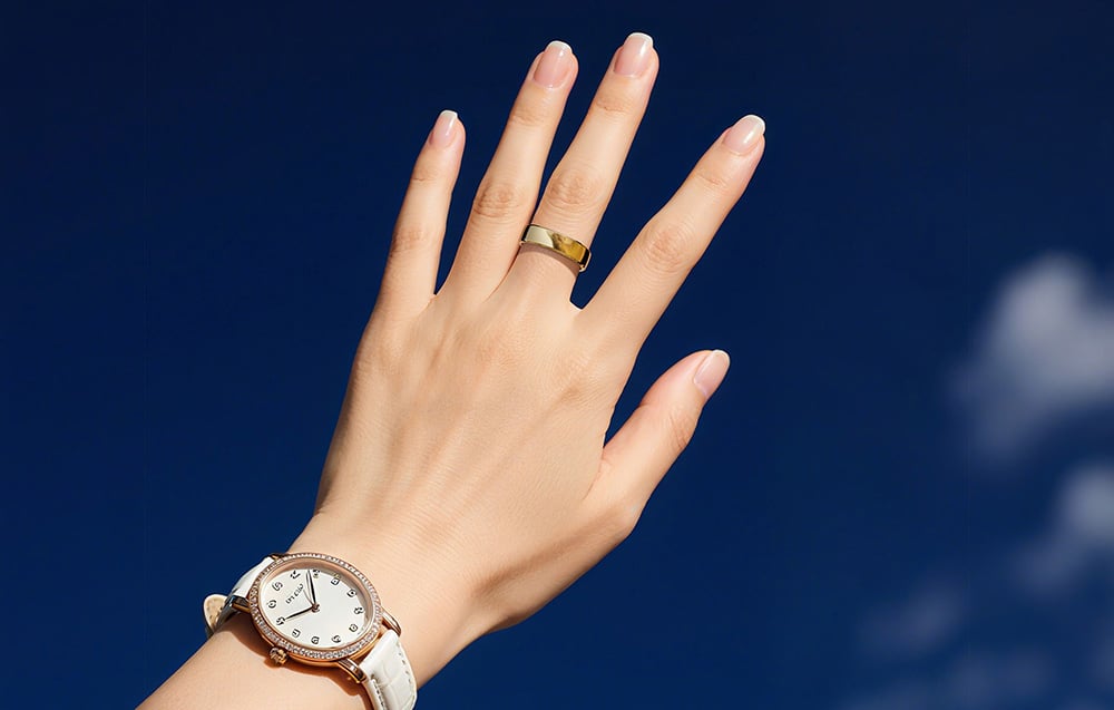 Solidna obudowa smartringu RingConn Gen 2 została wykonana z odpornego stopu tytanu oraz żywicy epoksydowej klasy medycznej i zabezpieczona trwałą powłoką PVD nanoszoną metodą próżniową, co zwiększa odporność na zarysowania i zapewnia bezpieczeństwo v kontakcie ze skórą nawet przy całodobowym noszeniu. Smukły design o grubości zaledwie 2 mm sprawia, że pierścień pozostaje dyskretny i wygodny, a niska waga (2 g) pozwala zapomnieć, że masz go na palcu. Klasa wodoszczelności IP68 (do 100 m) umożliwia korzystanie z gadżetu podczas mycia rąk czy treningów, dając Ci pewność, że będzie działał niezawodnie w każdych warunkach dnia. Dla uzyskania najwyższej precyzji pomiarów zaleca się noszenie pierścienia na palcu wskazującym, który charakteryzuje się stabilniejszym przepływem krwi. Jednak urządzenie zachowuje wysoką dokładność również na palcu środkowym lub serdecznym.