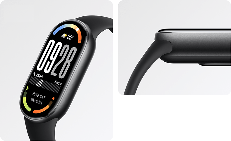Xiaomi Smart Band 10 wyposażono w 1.72-calowy wyświetlacz AMOLED o rozdzielczości 212 × 520 px. Zapewnia on wyraźny obraz, nasycone kolory i wygodną czytelność nawet w pełnym słońcu dzięki jasności sięgającej 1500 nitów HBM.