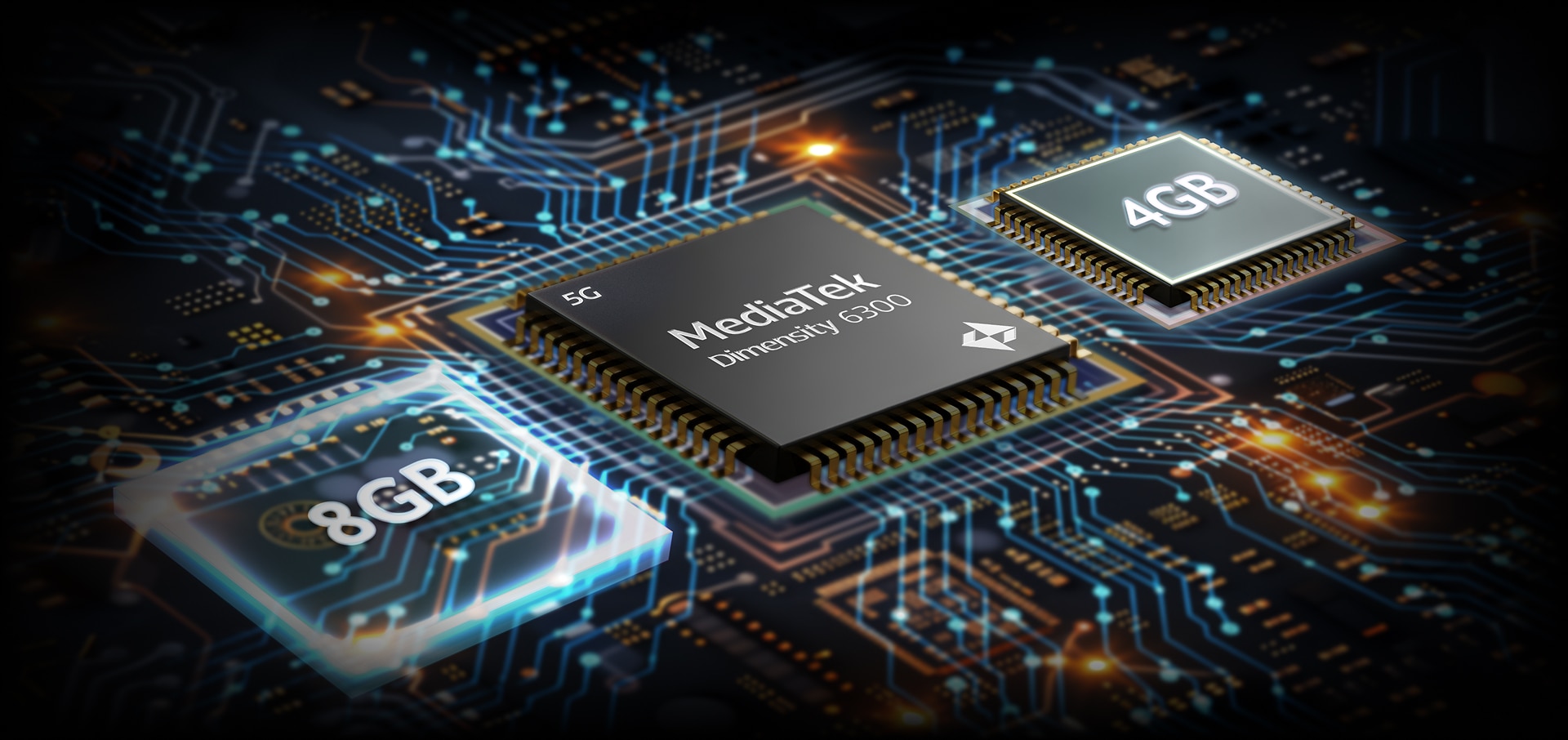 Przejdź przez zadania z prędkością dzięki procesorowi MediaTek Dimensity 6300, ośmiordzeniowemu procesorowi o prędkości do 2,4 GHz i zaawansowanej wydajności 6 nm.