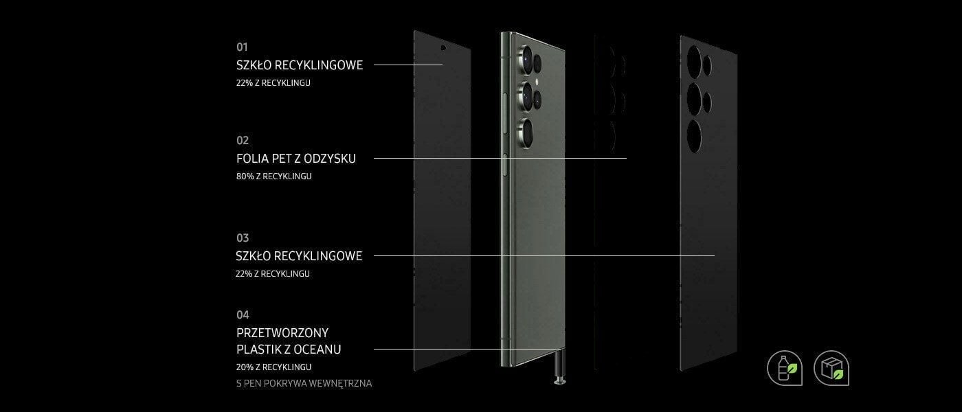 Samsung Galaxy S23 Ultra powstaje z poszanowaniem dla środowiska naturalnego. Do jego produkcji wykorzystywane są, między innymi, szkło i plastik pochodzące z recyklingu. Smartfon pakowany jest w papierowe pudełko wykonane z materiałów z odzysku, dodatkowo zabezpieczone papierową folią w celu ograniczenia zużycia plastiku.