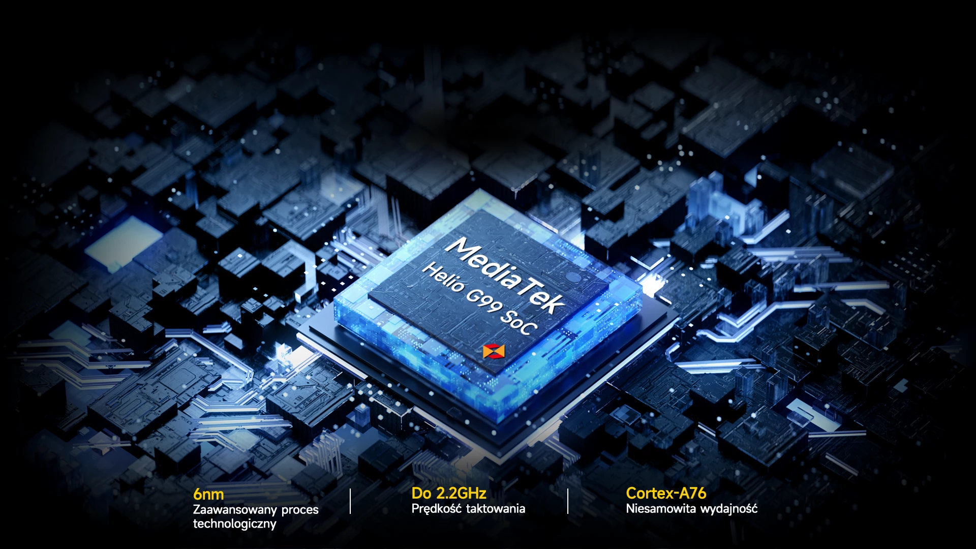 Osiągnij nowy poziom nieprzerwanej zabawy z nowoczesnym procesorem gamingowym Helio G99, który dysponuje ośmioma rdzeniami Arm Cortex-A76, stworzonym z myślą o błyskawicznej i płynnej akcji w grach. Dzięki energooszczędnej technologii 6nm możesz cieszyć się długimi sesjami bez obawy o częste ładowanie, pozostając w grze na dłużej.