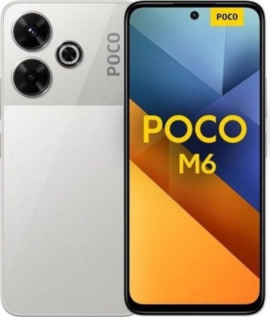 Xiaomi Poco M6 4G. Długość przekątnej ekranu: 17,2 cm (6.79"), Rozdzielczość: 2460 x 1080 px. Typ procesora: MediaTek, Model procesora: Helio G91 Ultra. Pojemność pamięci RAM: 8 GB, Typ pamięci RAM: LPDDR4X, Pojemność pamięci wewnętrznej: 256 GB. Rozdzielczość kamery tylna (numericky): 108 MP, Typ aparatu tylnego: Podwójny obiektyw. Obsługa kart SIM: Hybrid Dual SIM. Zainstalowany system operacyjny: Android 14. Pojemność baterii: 5030 mAh. Kolor produktu: Srebrny. Waga produktu: 205 g