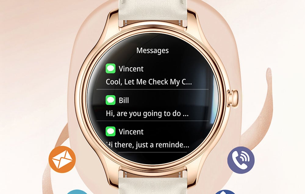 Ten elegancki model pozwala prowadzić rozmowy telefoniczne bezpośrednio z nadgarstka — dzięki Bluetooth 5.2 i wbudowanemu mikrofonowi oraz głośnikowi z funkcją HD Voice. Użytkowniczka może odbierać i odrzucać połączenia, przeglądać książkę kontaktową oraz historię rozmów. Zegarek synchronizuje powiadomienia z aplikacji, takich jak WhatsApp, SMS czy Facebook, a inteligentny asystent głosowy umożliwia sterowanie funkcjami i uzyskiwanie informacji bez dotykania ekranu.