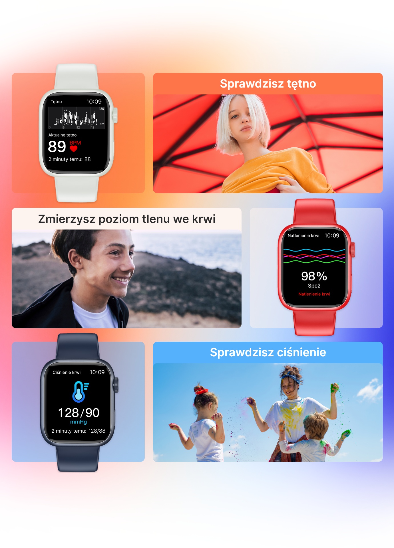 Pulsometr wbudowany w konstrukcję smartwatcha to doskonałe rozwiązanie dla użytkowników, którzy stale walczą o coraz lepsze wyniki sportowe. Ta funkcja pozwoli łatwo sprawdzić, jakie tętno umożliwia przebycie danego dystansu w określonym tempie. Na tej podstawie można opracować najbardziej efektowną technikę treningu. To oczywiście nie jedyne zastosowanie tej technologii. Stały monitoring tętna spoczynkowego pozwoli wykryć ewentualne problemy z ciśnieniem. Wszystko w trosce o Twoje zdrowie.
