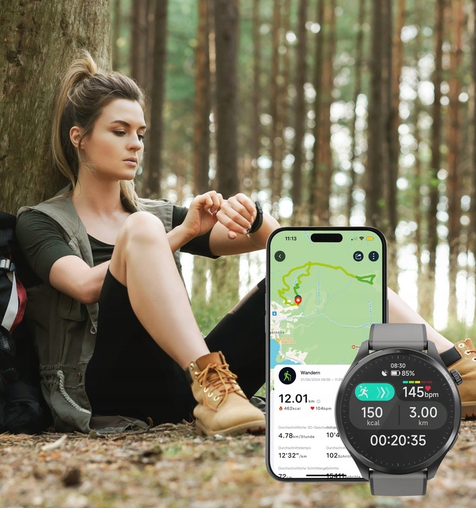 Smartwatch łączy w sobie wytrzymałość i elegancję. Stalowe przyciski i luneta, obudowa wzmocniona włóknem szklanym oraz wyświetlacz z hartowanego szkła Panda Glass 2,5D gwarantują odporność na codzienne wyzwania, niezależnie od warunków użytkowania.
