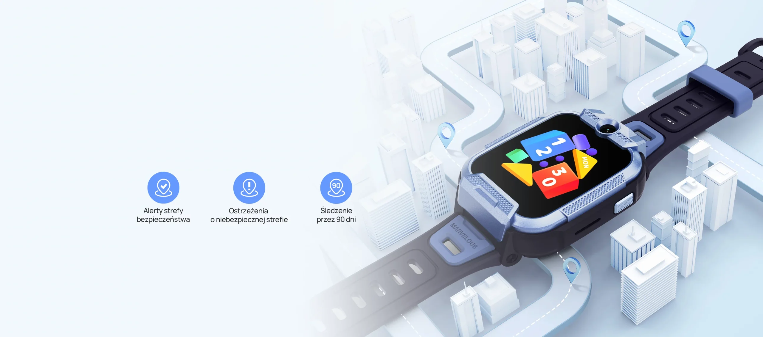 Dodatkowe funkcje | Licznik kroków, Przycisk SOS, Tryb "w klasie", Plan zajęć, Zdalna blokada, Biała lista kontaktów, Kontrola rodzicielska, Czujnik przyspieszenia, Budzik, Funkcja szukania zegarka, Informacja o nadchodzącym połączeniu, Kalendarz, Kalkulator, Pogoda, Pomiar dystansu, Powiadomienia z aplikacji, |