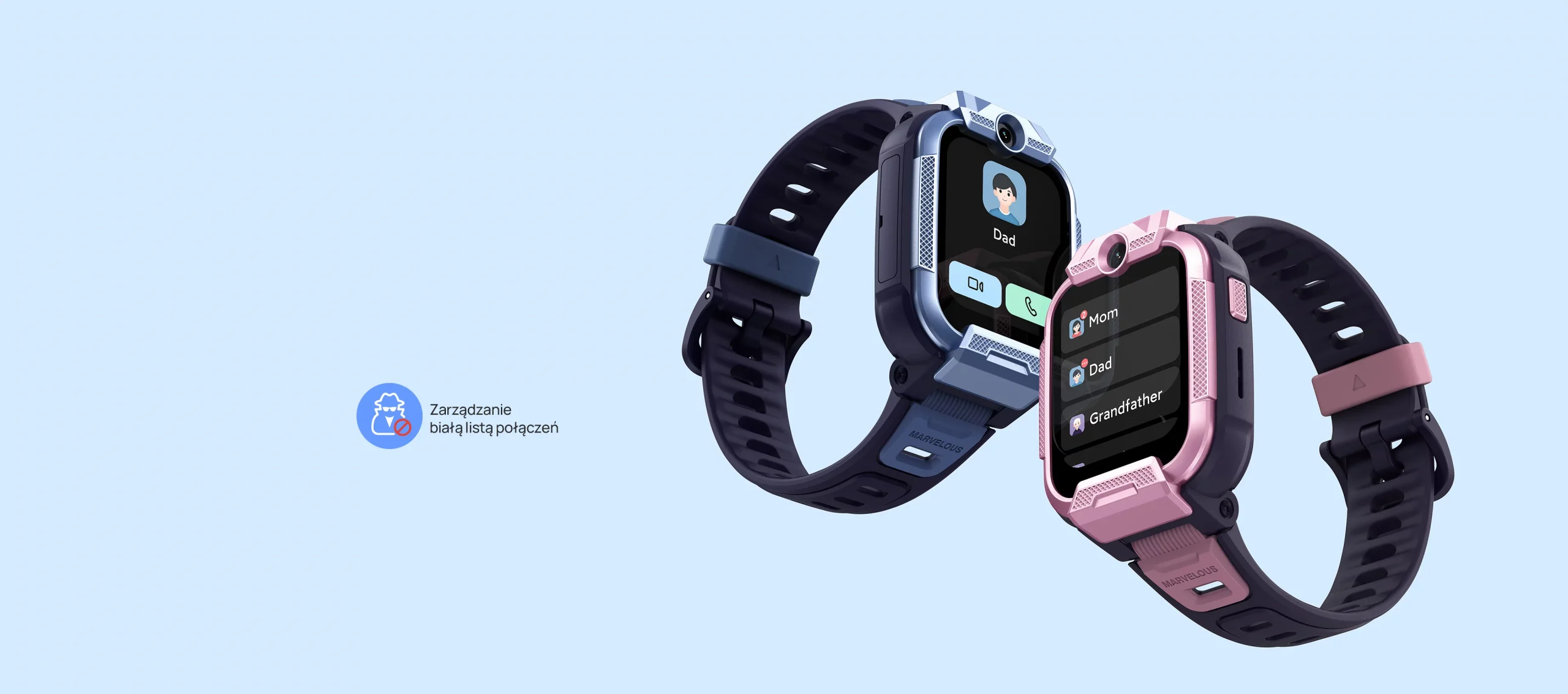 Funkcja białej listy pozwala na kontakt z dzieckiem jedynie członkom rodziny oraz bliskim przyjaciołom, co gwarantuje bezpieczną komunikację dla młodszych użytkowników.