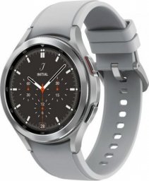 Samsung Galaxy Watch4 Classic. Długość przekątnej ekranu: 3,56 cm (1.4"), Technologia wyświetlacza: Super AMOLED, Rozdzielczość: 450 x 450 px, Ekran dotykowy. Taktowanie procesora: 1,2 Mhz, Pojemność pamięci RAM: 1500 MB, Pamięć Flash: 16 GB. Wi-Fi. GPS. Pojemność baterii: 247 mAh. Waga produktu: 52 g. Tworzywo paska: Silikon, Kolor paska: Srebrny. Zainstalowany system operacyjny: Wear OS