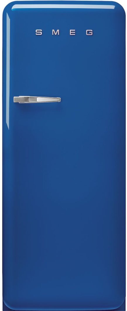 Model FAB28RBE6 wyróżnia się chromowanym uchwytem oraz logo marki Smeg, co podkreśla jego niepowtarzalny charakter. Niebieski kolor nadaje mu świeżości i sprawia, że staje się centralnym punktem każdej kuchni.